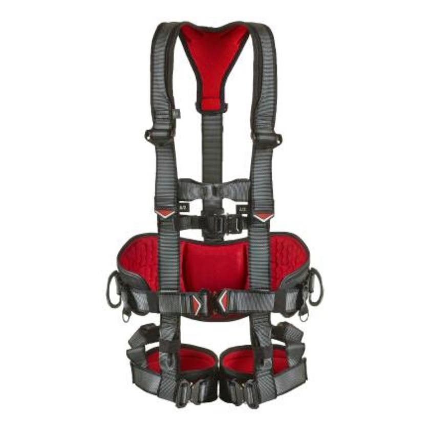Anslutningspunkten för fallskydd på bröstet är försedd med tygöglor, medan anslutningspunkten på baksidan har en galvaniserad D-ring. En extra anslutningspunkt, låg och avsedd för positionering, är också utrustad med tygöglor. Selen inkluderar ett ergonomiskt stödbälte med galvaniserade D-ringar för stödfunktion, vilket ger extra komfort. Ryggstoppningen är gjord av material som andas och benstoppningen ger behaglig sittkomfort. Bältet är försett med ringar för att fästa karbinhakar och tillbehör, såsom verktygsväskor. Cobras automatiska snabbspännen används på benremmarna för enkel och pålitlig justering. Med ett polyesterband som mäter 45 mm i bredd och har en bandstyrka på över 30 kN, är denna sele redo att möta utmanande krav på arbetsplatsen.